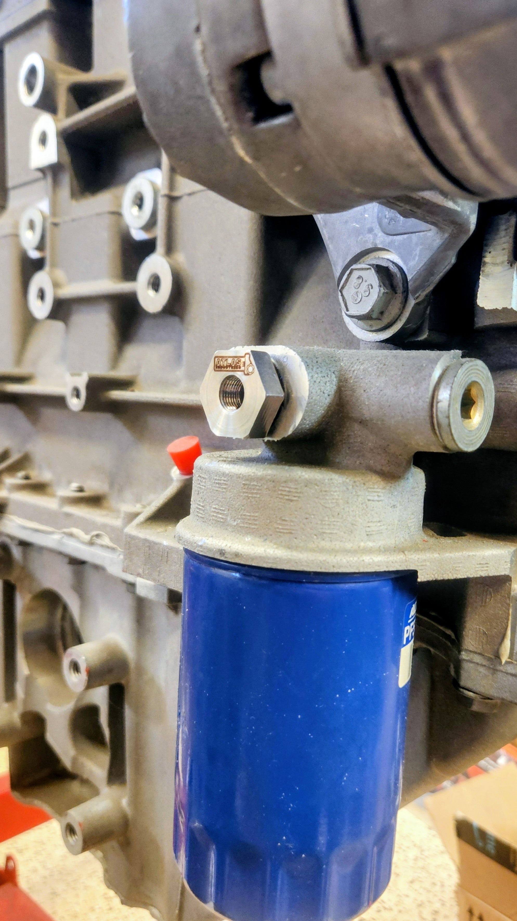 Please note: This fitting will NOT fit the oil galley ports on the side of the block or the un-used port at the front of the oil filter housing. Do not attempt to use it there for oil feeding.